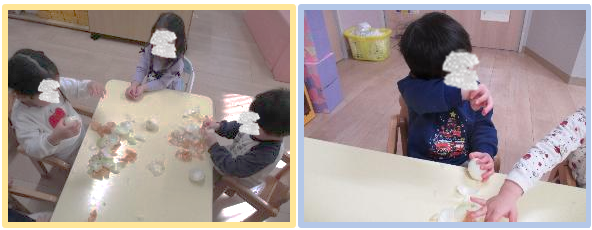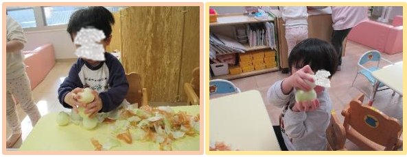 玉葱の皮が薄く、むくのに苦戦していましたが、先生やお友達と一緒に頑張ってむいて、綺麗な白い玉葱をみつけていました!