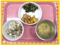 今回用意した具は、ふりかけ(ゆかり)、塩昆布、鮭、おかか、カレー炒めの5種類と、給食で提供した魚のネギ味噌焼きと切り干し大根のそぼろ煮です!