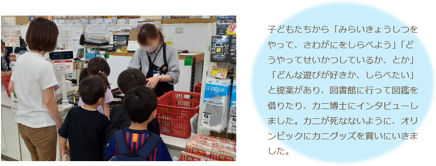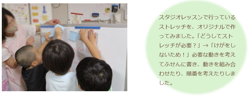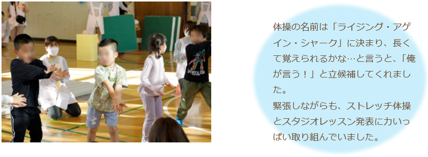 スタジオレッスンで「前転はおへそを見る」などの講師からのアドバイスにあたり、視線やバランスについて認識を深めたことで、ただ運動するだけでなく、バランスや視線を意識して効果的に運動を行うことができていました。「自分の動きはどう見えるのか」という視点で動きをとらえ、ボディイメージを豊かにし、表現を楽しんでいました。
